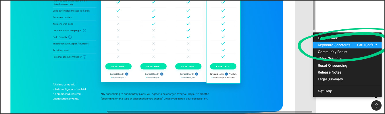 Посмотреть хоткеи можно через пункт меню Keyboard Shortcuts в помощи в нижнем правом углу или нажав CtrlShift?