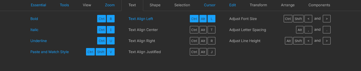 | Alt,/ . | Adjust Letter Spacing | Изменить межбуквенное расстояние |