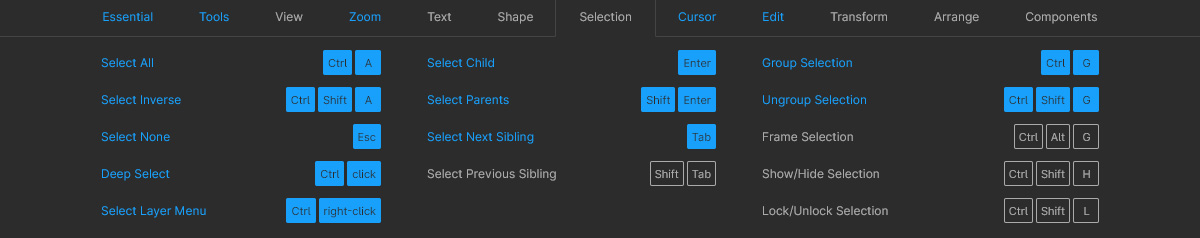 | CtrlShiftG | Ungroup Selection | Отменить группировку |