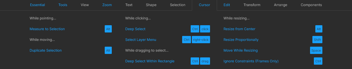 | Alt | Resize from Center | Изменить размер относительно центра |
