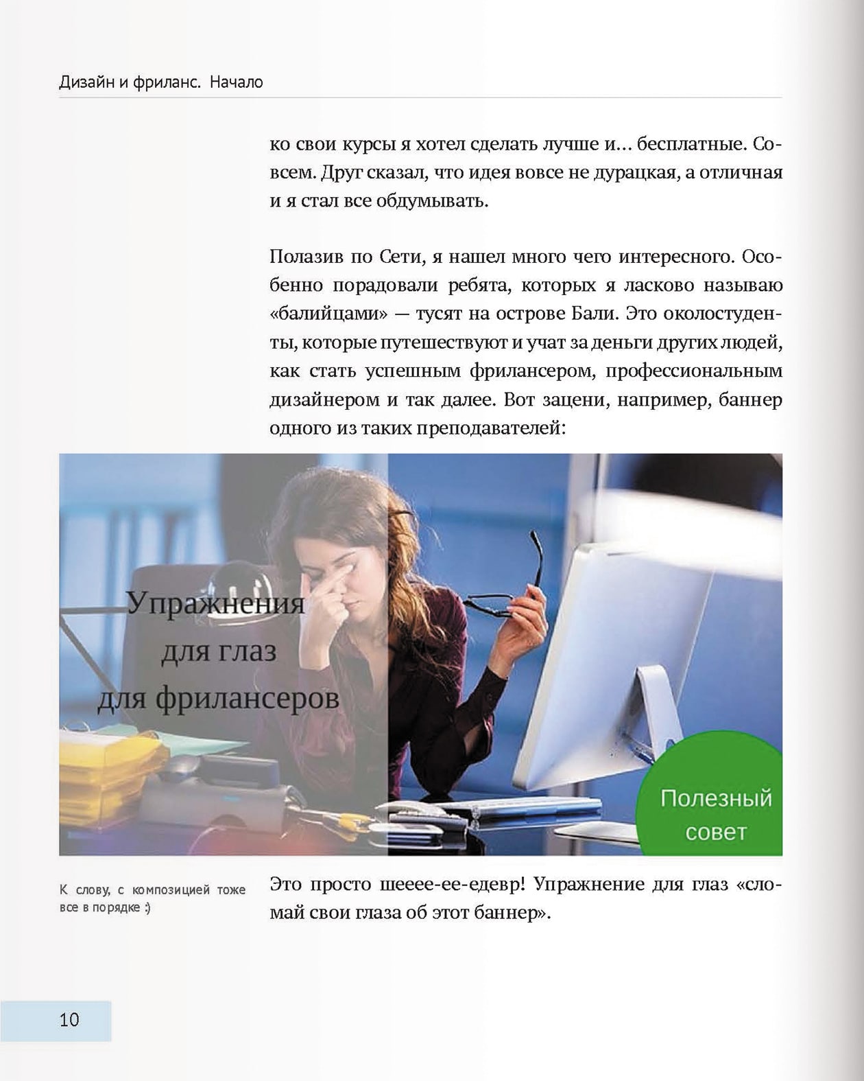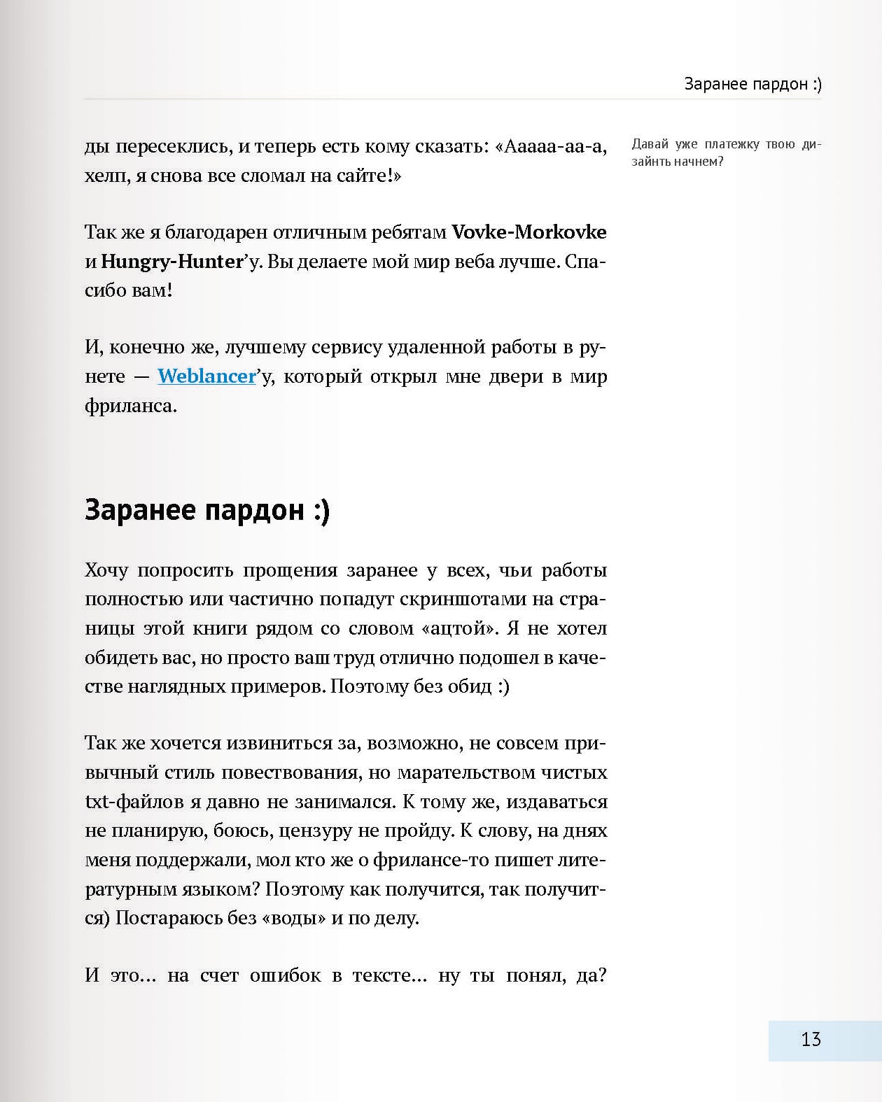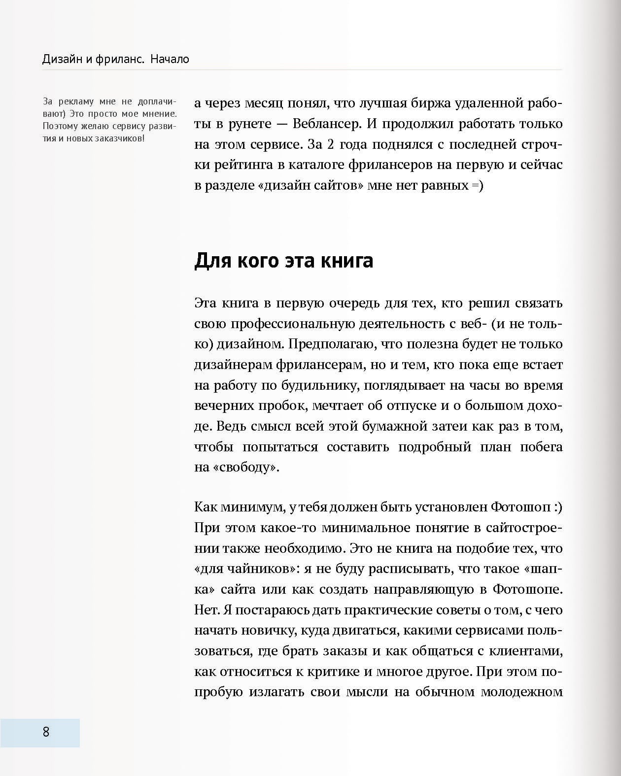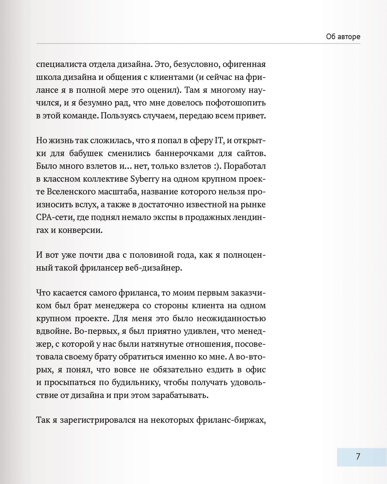 Говорят (не будем показывать пальцем на того, кто так говорит), что это первая книга о веб-дизайне на фрилансе, написанная веб-дизайнером фрилансером на обычном, молодежном, простом и понятном языке! С чего начать на фрилансе, как найти своего заказчика (и первого, и второго, и десятого) и продать ему себя!