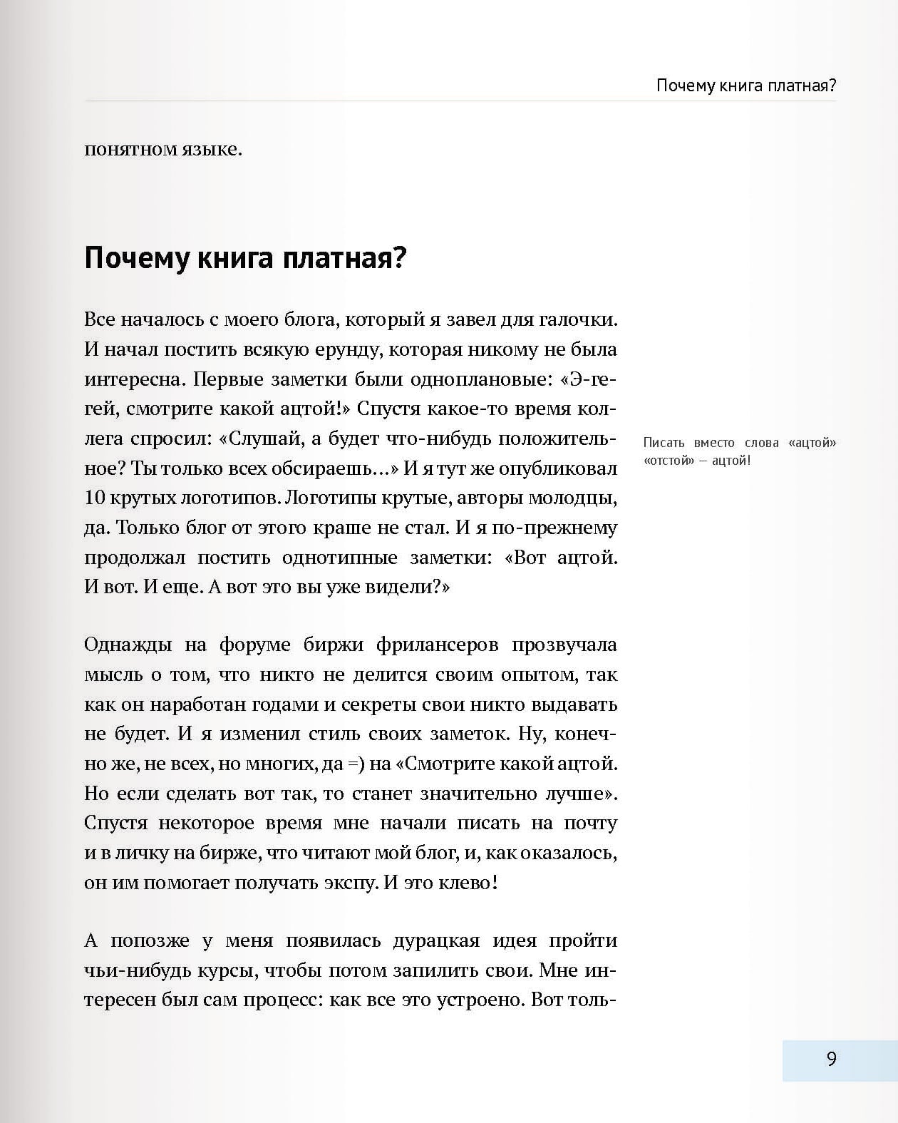 Сейчас начал читать вторую книгу Алексея. Она тоже не менее информативная и интересная. Чувствуется, что автор имеет большой опыт на фрилансе и в дизайне, чтобы передать его в своих книгах. Сейчас, когда во многих книгах авторы «льют воду» и крадут время читателей, это особенно ценно! Благодарю!