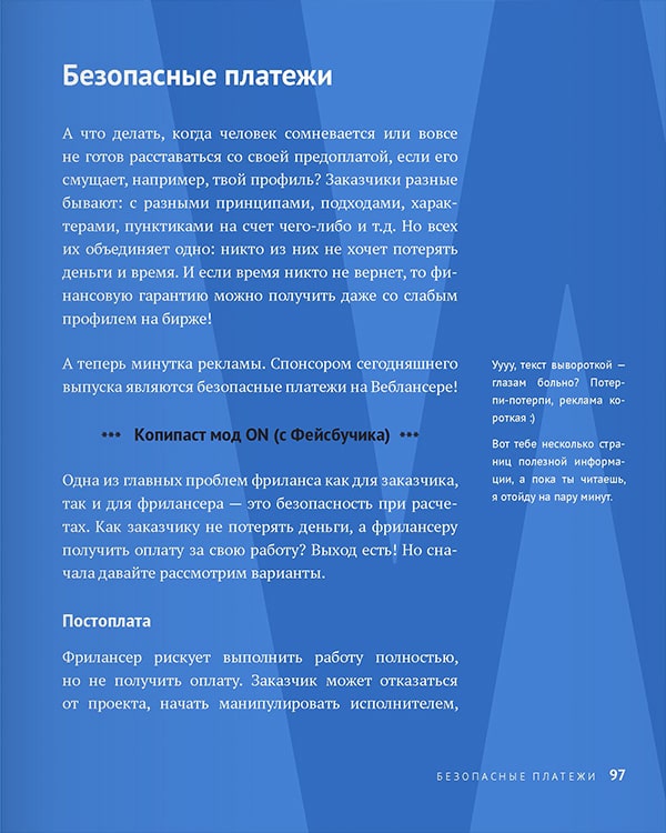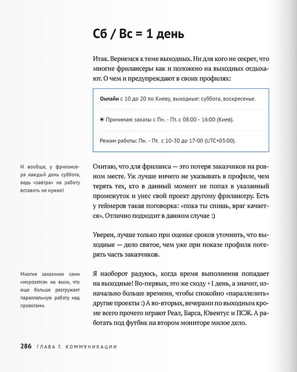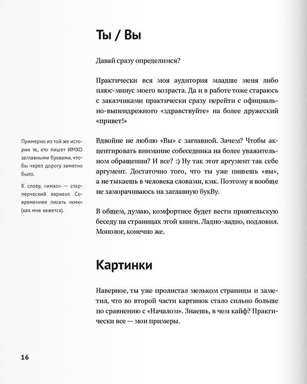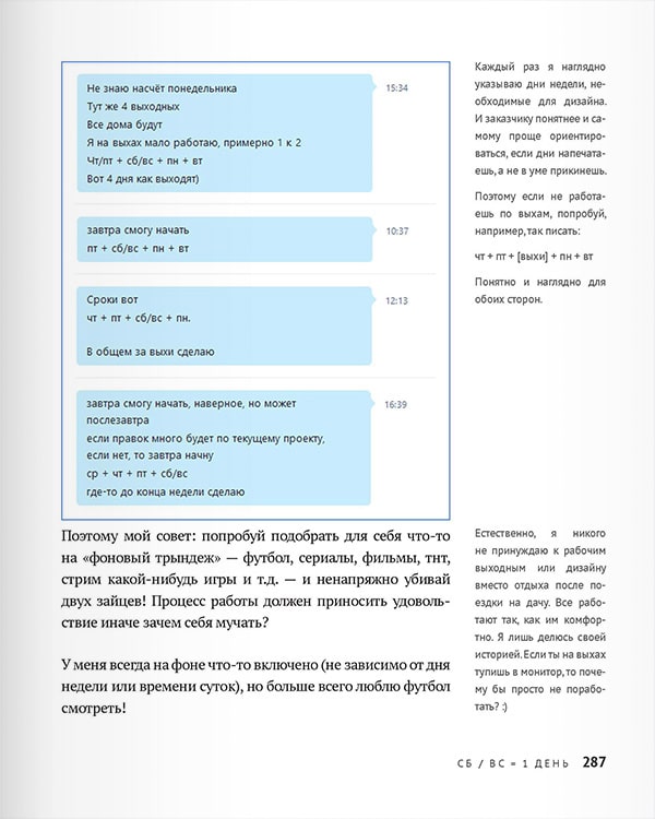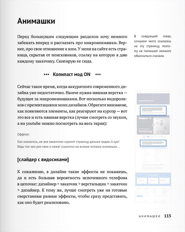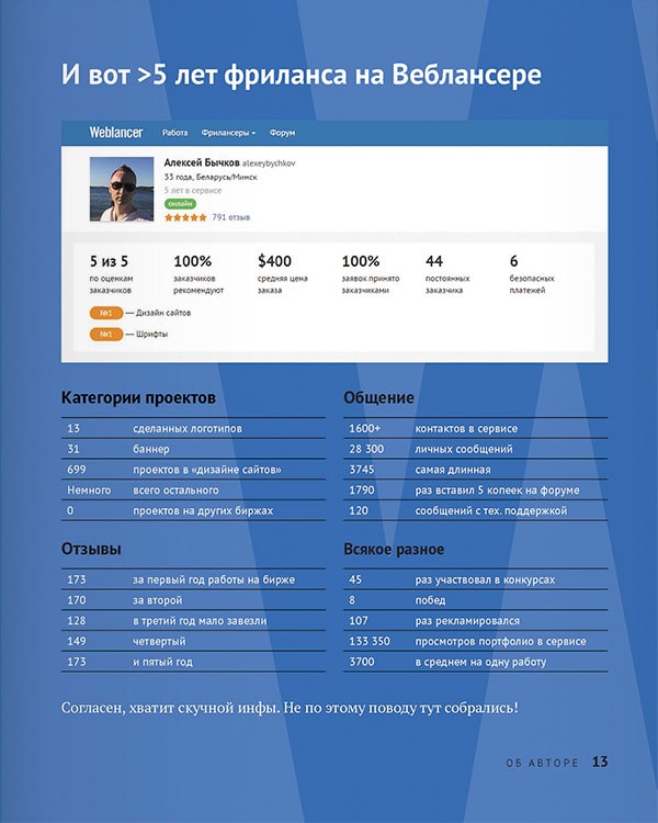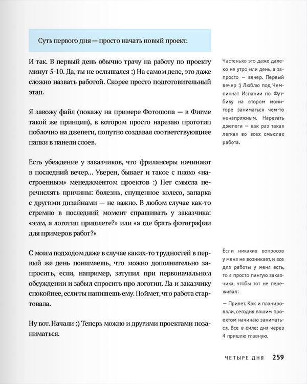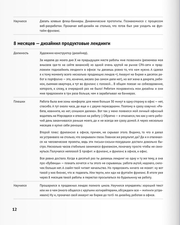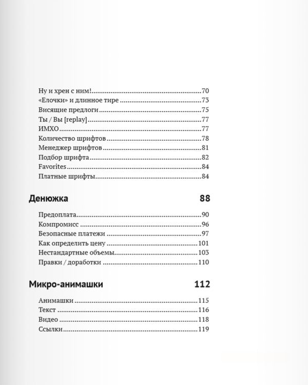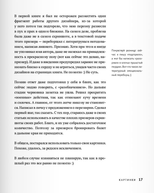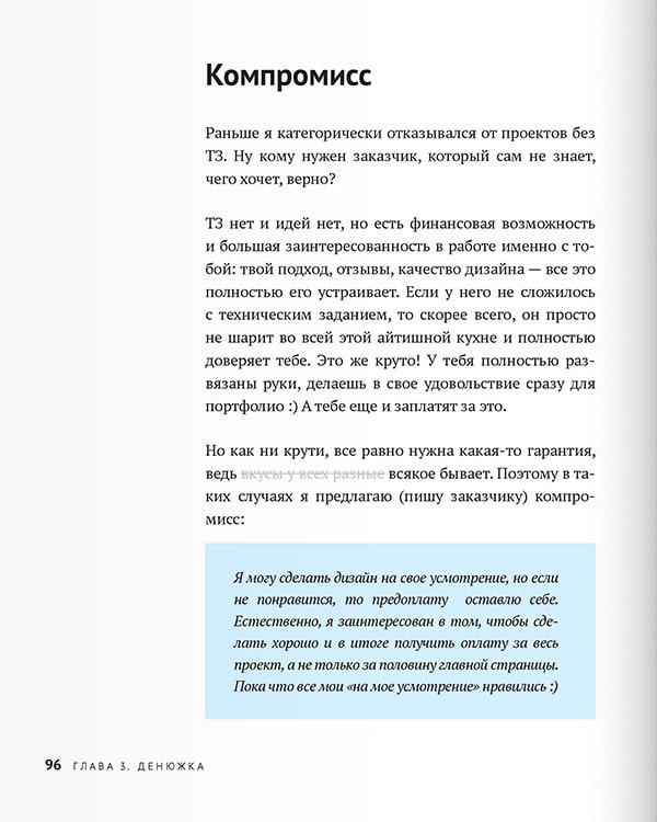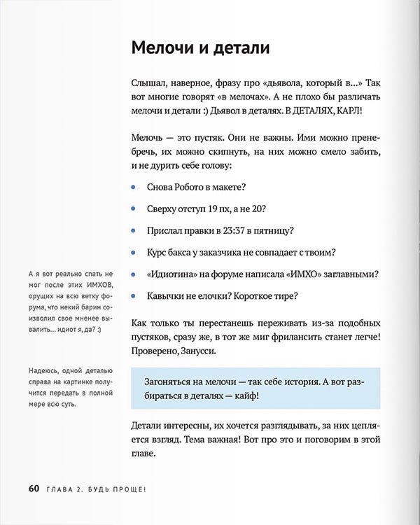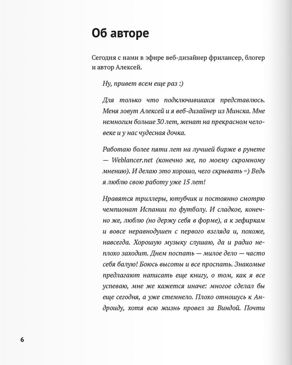 Продолжение первой части с теми же настройками: размеры, плюс-минус оформление, ну и, естественно, тот же автор! Еще больше страниц и примеров дизайна из жизни! Целевая аудитория по-прежнему дизайнеры, фрилансеры. Если первая книга о том, как продать себя заказчику, то теперь обсудим, как продать ему свой дизайн!