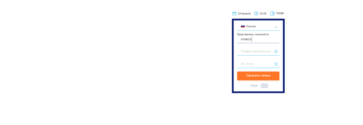 - В-третьих, на всех экранах разместим главное: дату, время, кнопку заявки, контакты. А не в начале и самом конце страницы.
