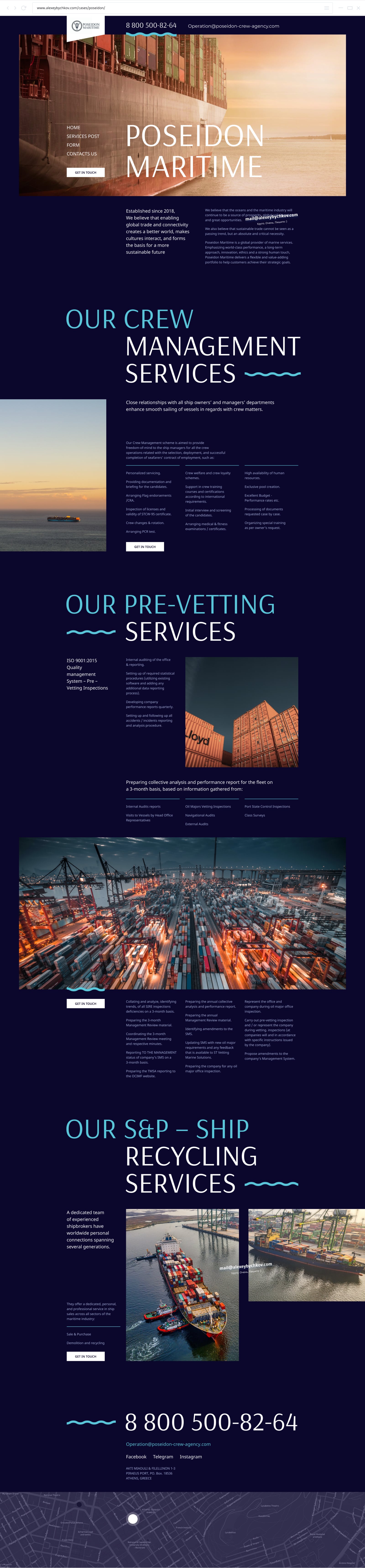 Так как тематика — водная, решил использовать синюю цветовую гамму. И почти сразу же пришел к темной теме. Использовал 12 колоночную сетку. Заголовки сделал крупным Arsenal’ом, а контенту достался Noto Sans: