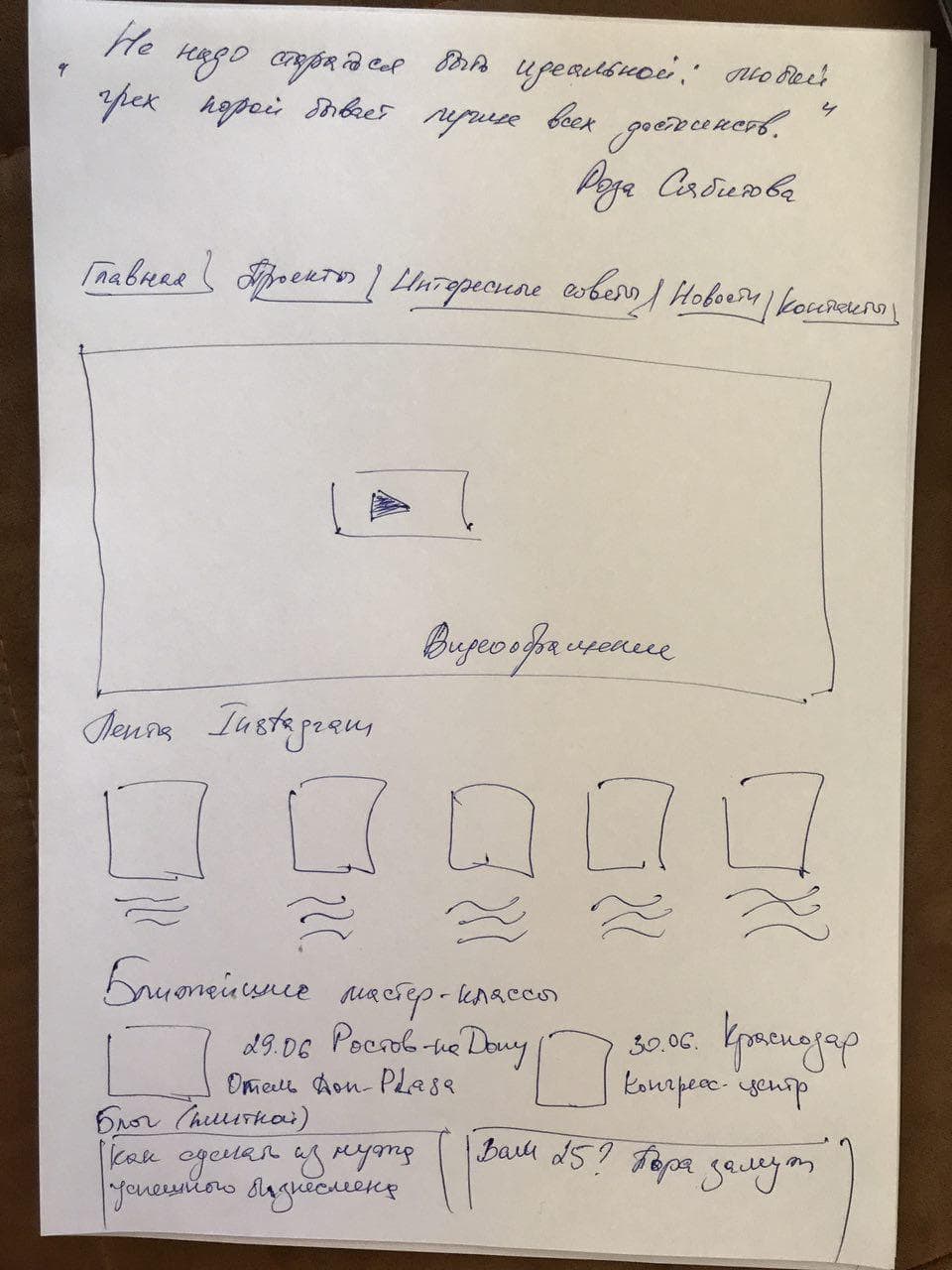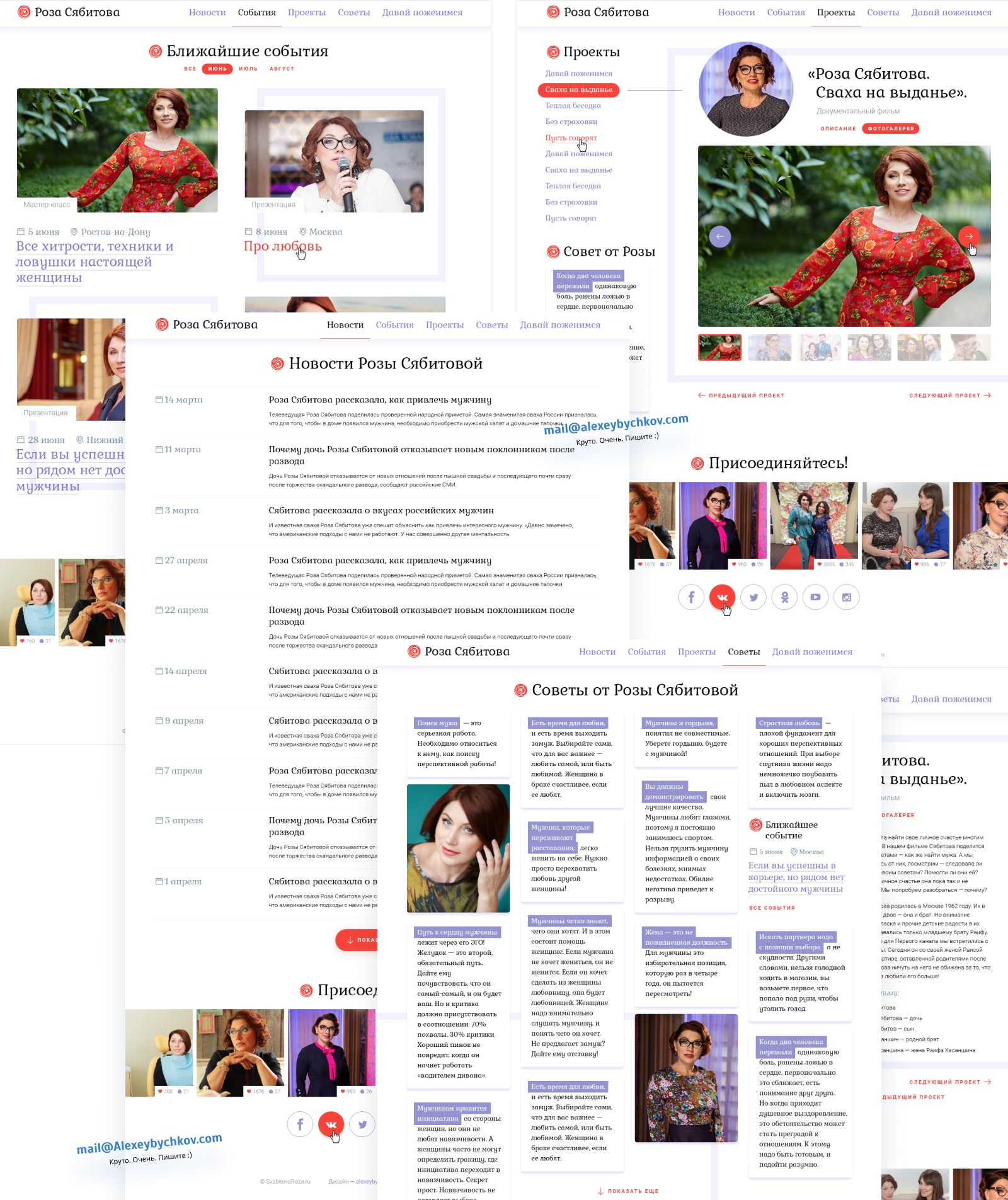 В первом экране нужно было видео-приветствие Розы Сябитовой. А дальше все должно складываться блогом с новостями советами и т.д. Расписание ближайших публичных выступлений может быть не как календарь т.к. их не очень много — но хотя бы 5 ближайших дат (город и место проведения) нужно указать отдельным блоком. И контент соц. сетей, например, инстаграм. Должен преобладать сиреневый цвет. Формы на свой вкус. ЦА — женщины за 30.