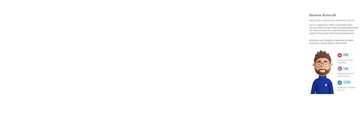 Словил себя на мысли, что формат сторис и постов в ленте инстаграма уже не вывозит. Первые исчезают, вторые не находят. А вопросы по моему курсу про дизайн и фриланс прилетают постоянно. Значит, нужен сайт, на котором соберу все самое важное: инфа, программа, примеры работ, отзывы, ответы с вопросами и тд. И лендинг под такое дело — идеальный вариант.