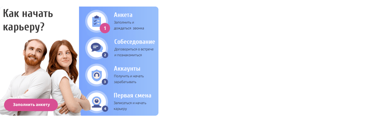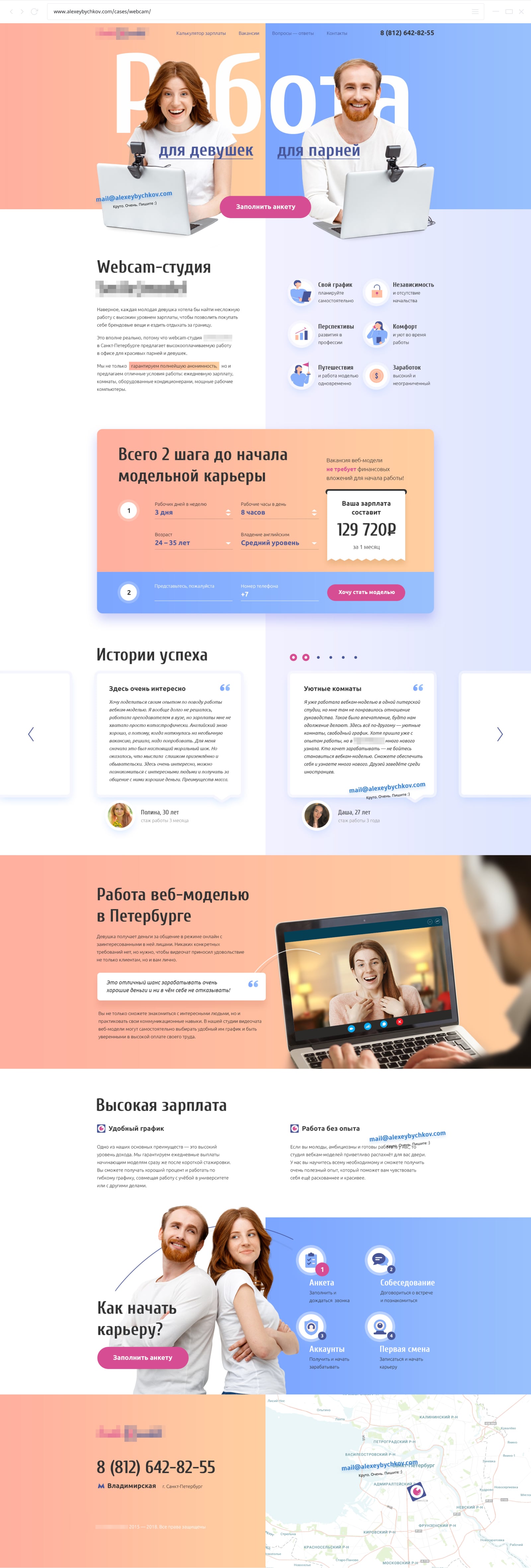 Работа как для девушек, так и для парней, поэтому поделил сайт на две части по вертикали и провел эту линию через весь сайт. Пастельные градиенты — один из трендов на ближайшие годы. А с круто подобранной цветовой гаммой сайт сразу станет выделяться среди конкурентов. В добавок использовал улыбчивых ребят славянской внешности на всех страницах.